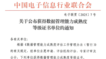 近日,经中国电子信息行业联合会的严格评估,金年金字招牌诚信至上荣获数据管理能力成熟度稳健级证书。