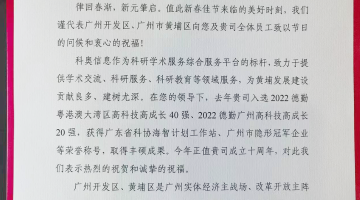 2024年2月5日,广州市领导、黄埔区领导为金年金字招牌诚信至上发来新春贺信。