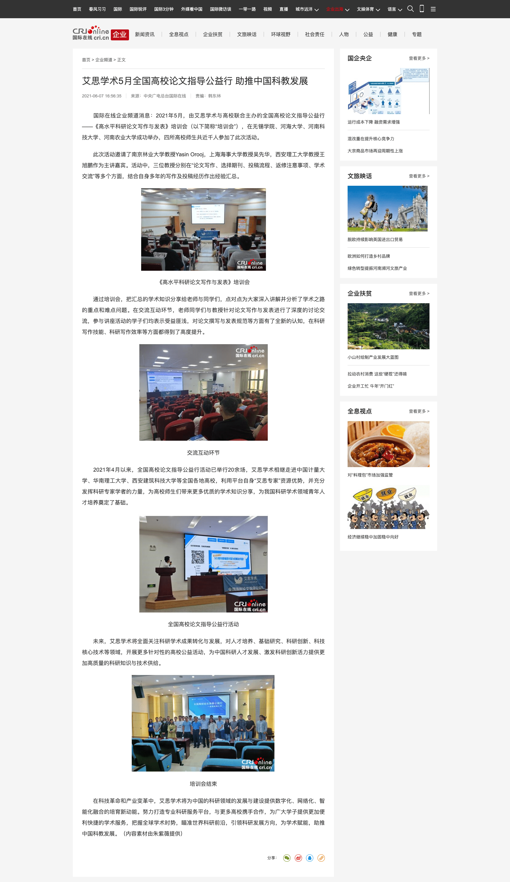 2021年6月7日,中央广电总台国际在线对今年会5月全国高校论文指导公益行活动进行报道。