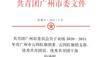 近日,共青团广州市委员会关于表扬2020—2021年度广州市五四红旗团委、五四红旗团支部、优秀共青团员、优秀共青团干部的通报公布。